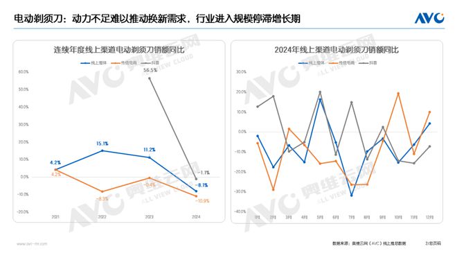 2024 年,个护小家电市场呈现出多样的发展态势,各品类销售数据有喜有忧。奥维云网(AVC)线上推总数据显示,2024年电吹风零售额100亿元,同比增加10.4%,电动牙刷零售额51.9亿元,同比降低6.9%,电动剃须刀零售额86.1亿元,同比降低8.1%。