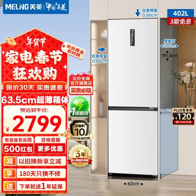 美菱冰箱402升双门一级能效无缝窄门家用电冰箱