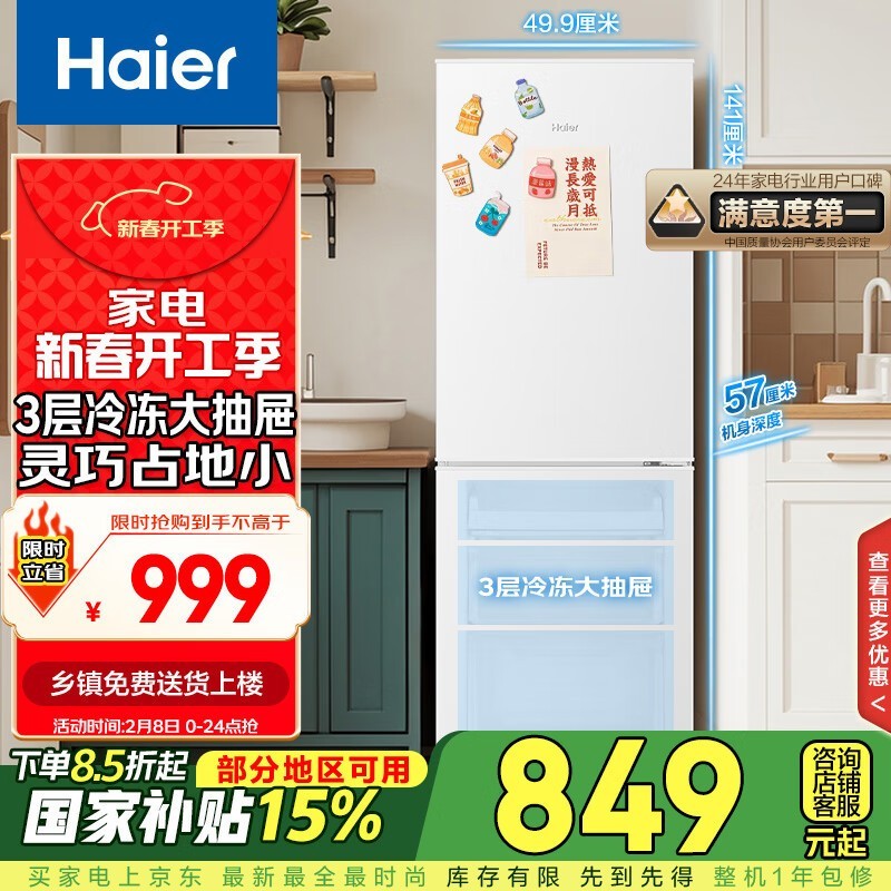 海尔直冷双门冰箱845元 支持国产品用