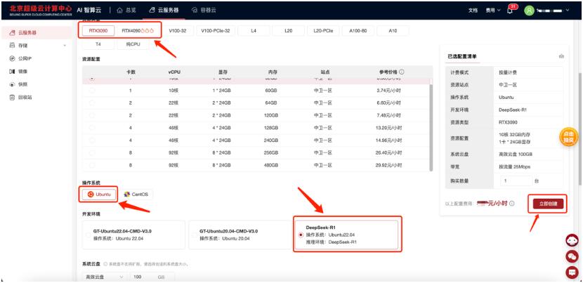 选择创建云服务器 -> 选中图中镜像,配置云盘与带宽等参数 -> 创建资源。