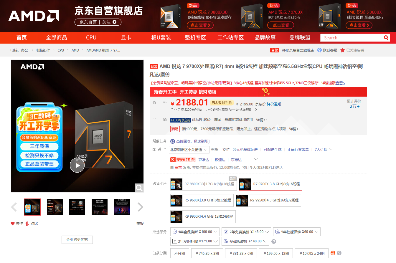 目前AMD 锐龙7 9700X处理器在京东自营旗舰店的报价是2199元,京东PLUS会员到手还能再优惠。同时大家购买之后可参与晒单抽周边壕礼的活动(指定型号前往页面查看),成为京东旗舰店会员还有首购返666京豆和积分抽大奖活动。目前AMD 锐龙7 9700X处理器处于3C数码开工开学季低价,想要在2025乙巳蛇年高效开局的朋友,相信锐龙7 9700X就是您最好的选择。