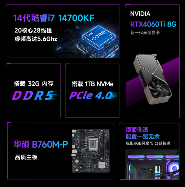 显卡方面,它配备 RTX4060Ti,基于 NVIDIA Ada Lovelace 架构,拥有 4352 个 CUDA 核心与 8GB GDDR6 显存 。相比上一代,光线追踪性能提升一倍,结合 DLSS 3.5技术,能实现性能大幅提升,逼真还原游戏场景,无论是大型 3A 游戏还是创意设计软件,都能稳定流畅运行。
