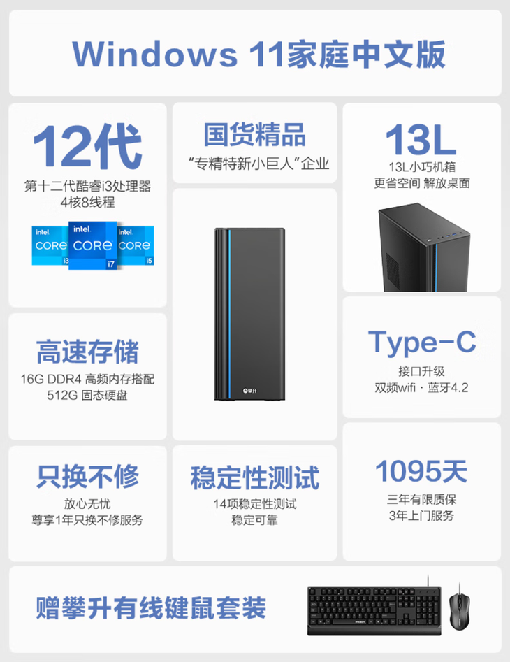 对于办公需求的用户来说,这里推荐的是攀升商睿3,是一款一台质价优、性能强的台式机,攀升商睿3搭载12代酷睿i3-12100处理器,采用英特尔第12代酷睿架构,4核8线程,单核睿频高达4.3GHz ,12MB三级缓存与增强核显,性能出众。在日常办公、网页浏览、视频播放等场景中表现流畅,增强版核显满足日常办公和轻度图形处理需求。