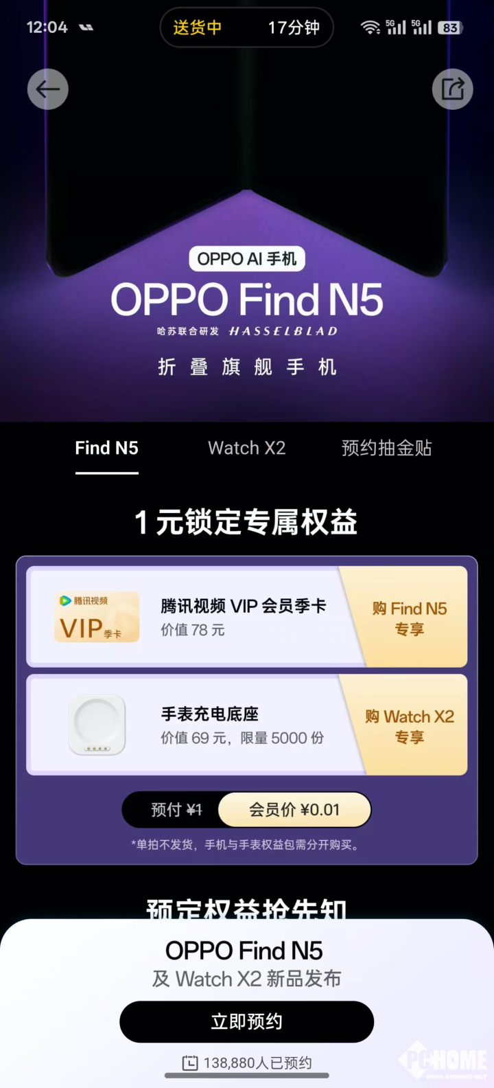 预约购买OPPO Find N5新品的用户,可以获得价值78元的腾讯视频VIP季卡会员权益,购买Watch X2的用户,可获得价值69元的手表充电底座一个。
