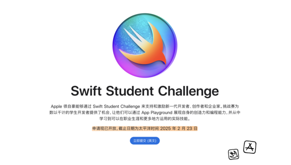 2025年2月,新一届Swift学生挑战赛正式启动,此次申请截止日期为太平洋时间2025年2月23日。今年苹果将选出350名Swift Student Challenge获奖者,以表彰在创新思维、卓越创意、社会影响或多元包容等方面表现出色的优秀作品,在这些获奖者中,还会有50名选手有机会前往位于库比提诺的Apple园区。