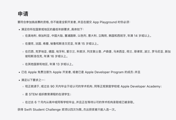 苹果也在官网给出了参赛要求,要符合参加挑战赛的资格,须确保自己不是全职开发者,并且在提交 App Playground时必须满足所在国家或地区的最低年龄要求: