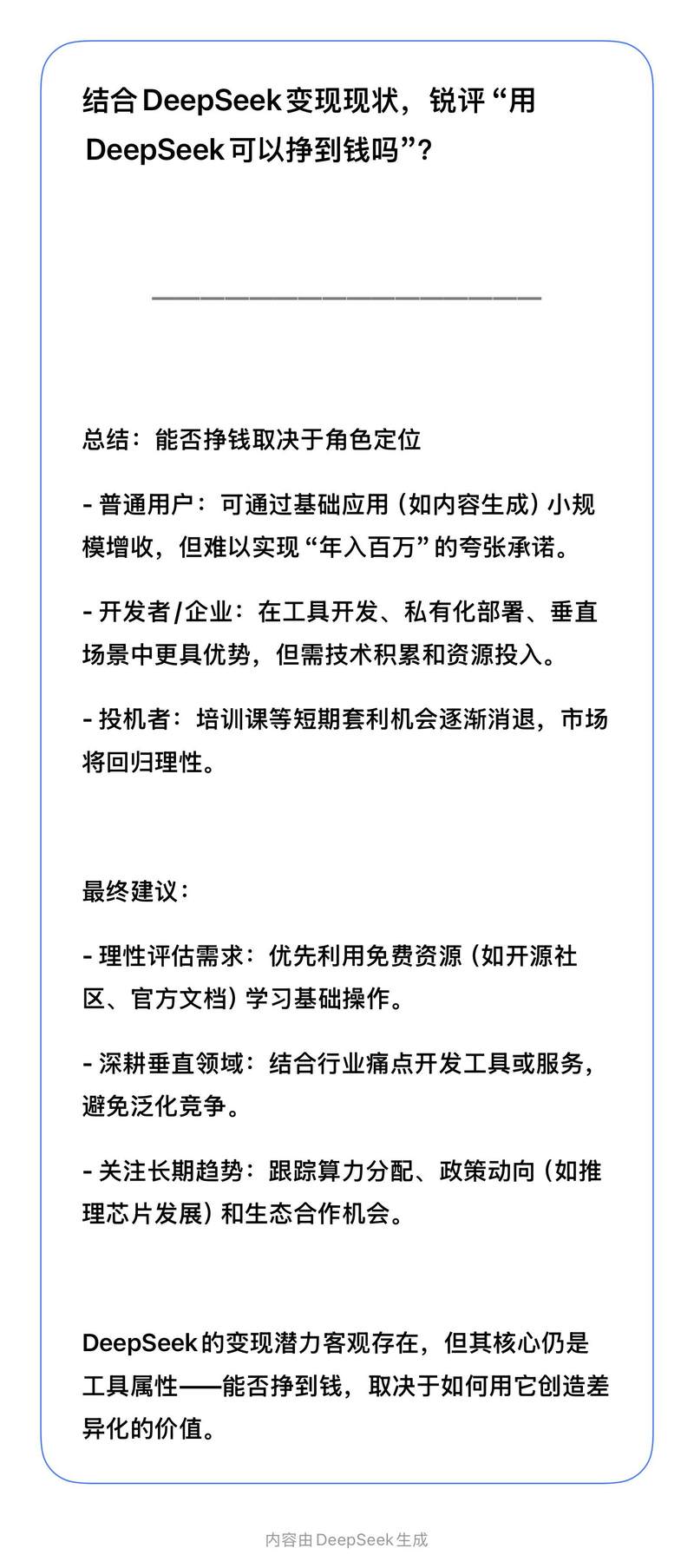 DeepSeek锐评:能否挣到钱“取决于你是谁”