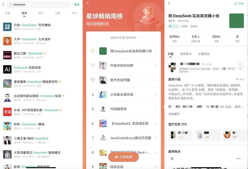 DeepSeek赚不赚钱还未可知,但围观者们几乎都想用DeepSeek赚钱。知识付费应用“知识星球”上,与DeepSeek相关的社群名大多包含“赚钱”、“搞钱”、“副业”、“变现”等关键词。