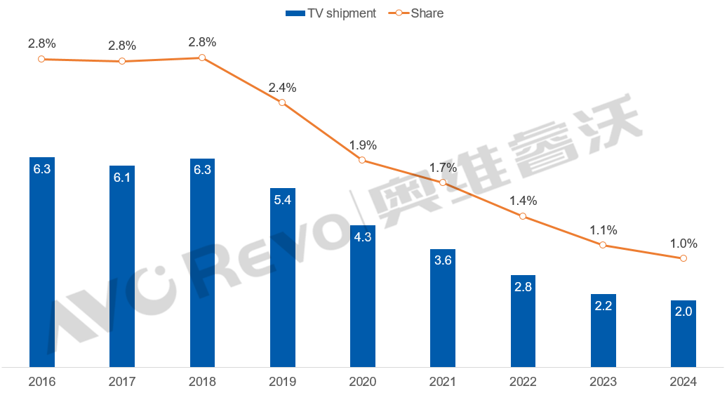 据行业机构奥维睿沃数据显示,松下电视全球出货量已从2016年的631万台下降到2024年的202万台,全球市场占有率退守到仅有1.0%。