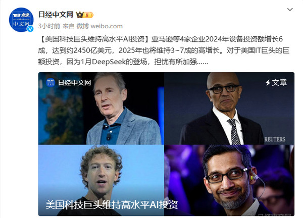 尽管面临新兴企业DeepSeek的竞争压力,这些科技巨头并未放缓其投资步伐。DeepSeek宣布已研发出低成本、高性能的AI技术,这一消息一度引发市场对英伟达等芯片制造商的担忧,导致其市值大幅下滑。然而,美国科技巨头们认为,低成本AI技术的出现将扩大整个市场,从而带来更多商机。