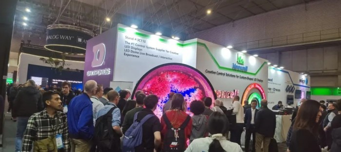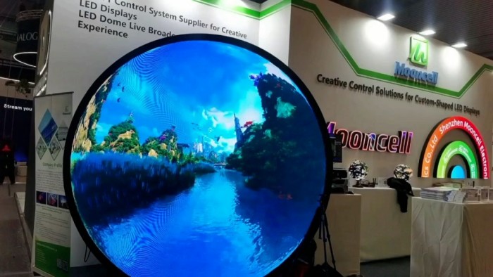 摩西尔内球解决方案作为本场展会的最大亮点,聚焦了观众目光。方案采用摩西尔异形主控独有的动态插值算法,对LED模组进行内球平面展开,利用图像任意角度旋转技术,对每圈物理空隙处进行图像插值填补,使球面图像显示上下左右相互连贯,实现超8K高清显示。