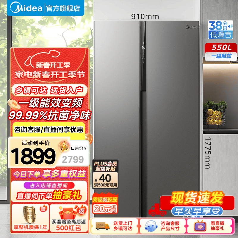 美的BCD-550WKPZM(E)智能节能冰箱,到手价1899元