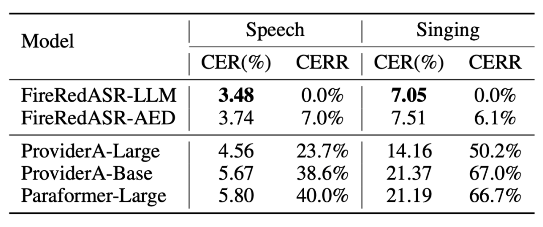 值得一提的是,在需要歌词识别能力的场景中,FireRedASR-LLM 也表现出极强的适配能力,CER 实现了 50.2%~66.7% 的相对降低,这一成果进一步拓宽了 FireRedASR 的应用范围,使其不仅能胜任传统语音识别需求,还能在创新性的多媒体场景中大放异彩。