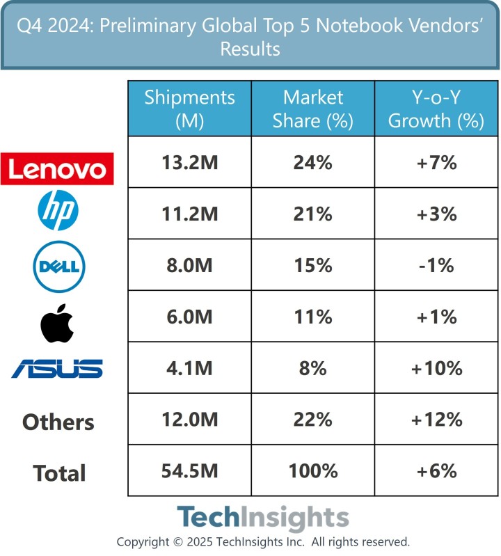 根据TechInsights最新发布的报告显示,2024年第四季度全球笔记本市场出货量与去年同期相比增长了6%,总计达5450万台。随着市场加速向2025年底Windows 10服务终止日期迈进,商用需求依然强劲。消费者需求虽然低迷,但在节假日期间确实有所增长,因为零售商和供应商对个人电脑大打折扣,以吸引注重价格的购物者。中国政府提供的补贴起到了拉动消费需求的预期效果。