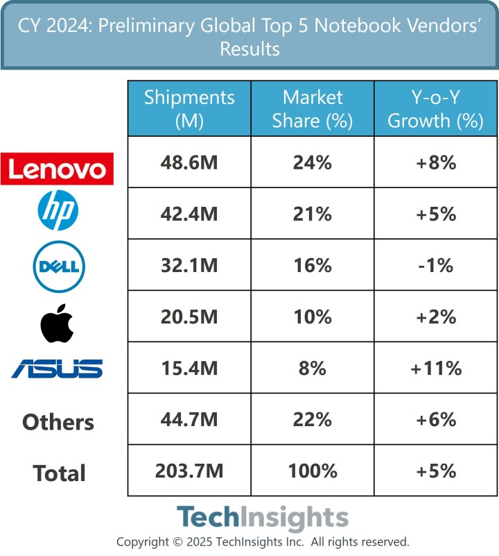 TechInsights最新报告显示全球笔记本市场出货量与去年同期相比增长了5%,总计2.037亿台。