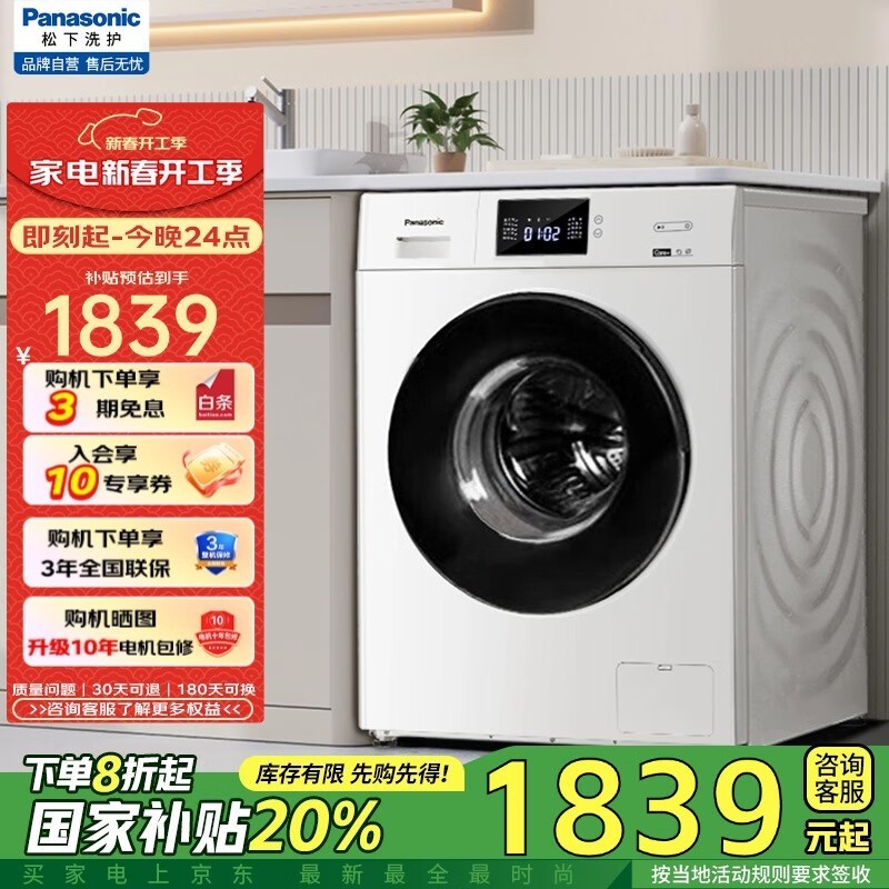 松下高效能大容量滚筒洗衣机XQG100-J105:前开设计,BLDC静音,除菌健康,节能环保享受新生活