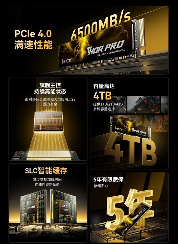 采用“高品质3D NAND闪存颗粒”、PCIe Gen4x4通道,支持SLC动态缓存技术。
