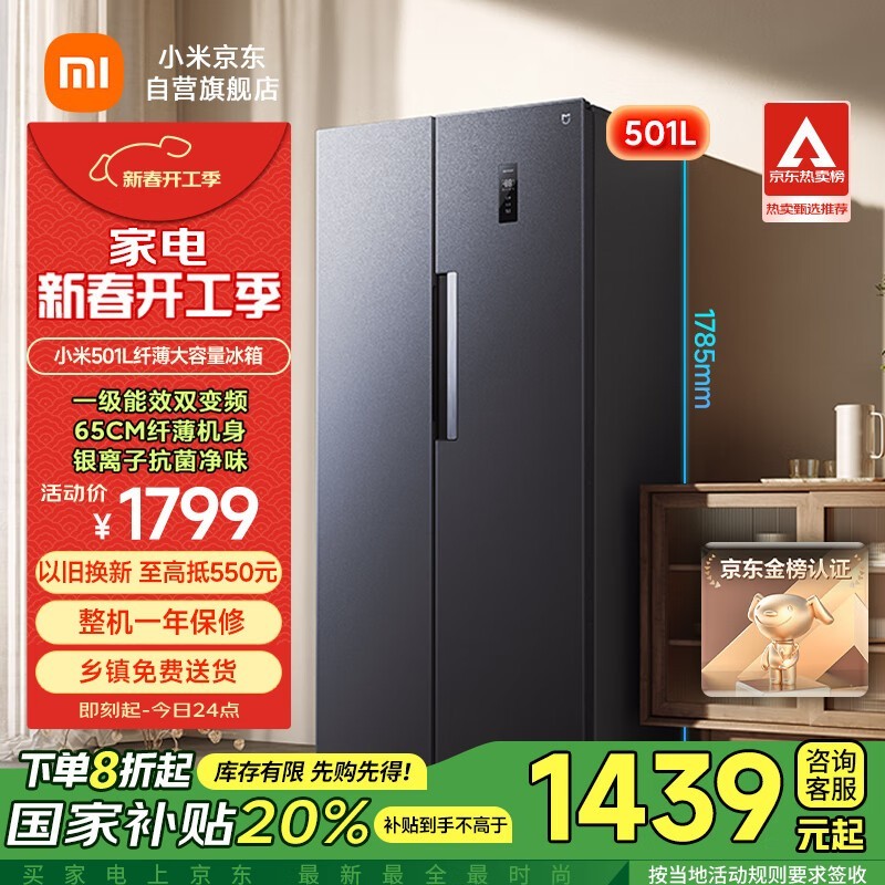 小米501L对开门冰箱优惠仅需1437元!购买还享国家补贴减20%