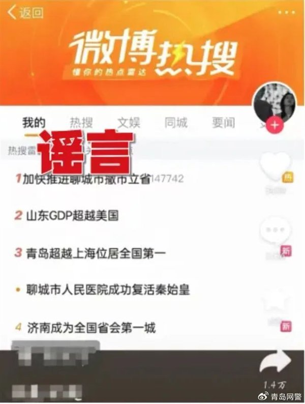 据报道,青岛网警披露了一起网络谣言案件。近日,山东聊城一网民在某网络平台发布虚假视频信息,该信息为“P图”伪造微博热搜榜图片,包含“聊城市人民医院成功复活秦始皇”“山东GDP超越美国”等不实言论。