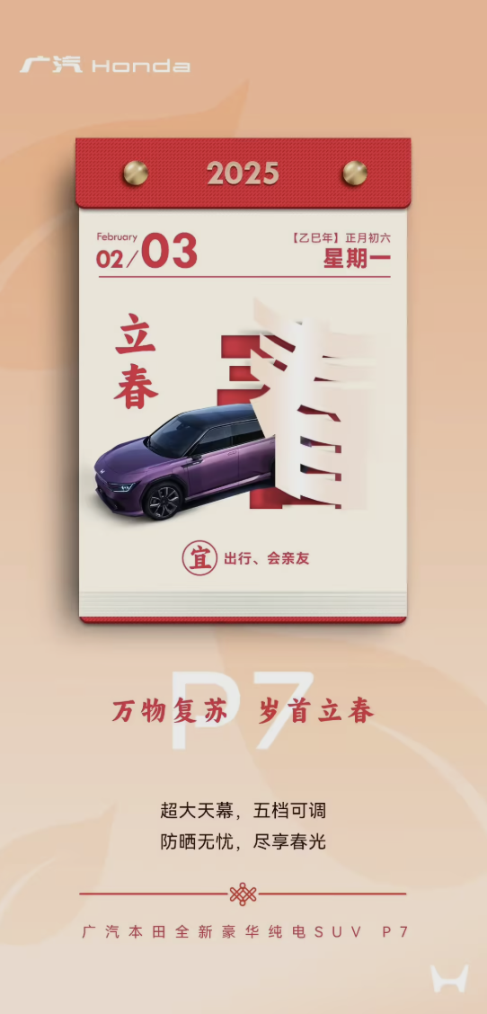 2月3日,广汽本田发布的立春海报中仅提及P7,未出现“烨”。