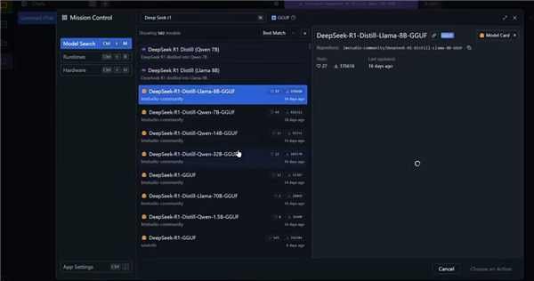 然后下载合适的模型,在主界面上方选择已下载的模型,然后调高“GPU Offload”的数值,不同选项的具体含义可自行搜索或者直接询问DeepSeek。