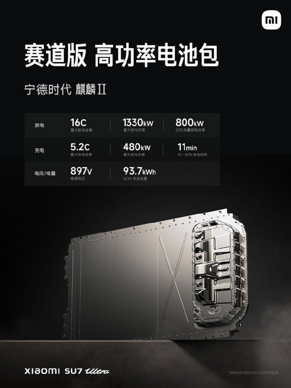 电池:配备宁德时代麒麟Ⅱ赛道专用高功率电池包,支持最高5.2C充电倍率,峰值电压为897伏,电量从10%充至80%仅需12分钟。