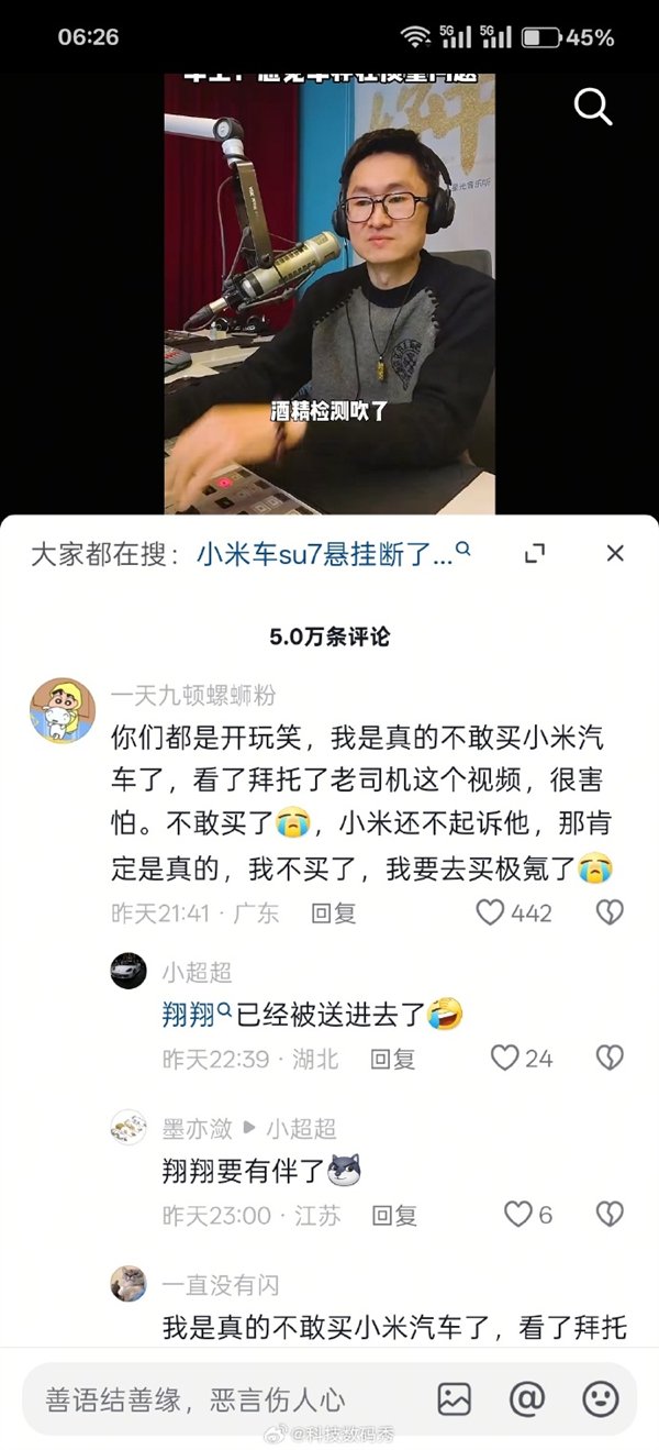有网友表示,这辆小米SU7的家属跟网上博主连线时说:没有喝酒、酒精检测吹了。