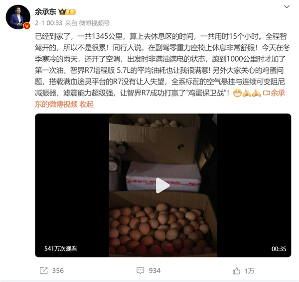 春节前,他就发微博表示,订购了一台鸿蒙智行豪华旗舰轿车享界S9,这个春节打算开享界S9全程智驾回安徽老家,陪年迈的父母一起过年;临近除夕的直播也是驾驶享界S9进行;而在返程时,他又开上了智界R7,不断分享驾驶感受,甚至上演了一场“鸡蛋保卫战”。