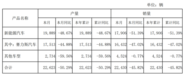 这个月,赛力斯集团的产销量均遭遇了腰斩。