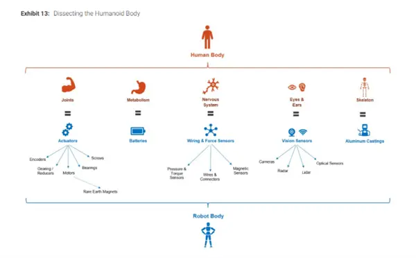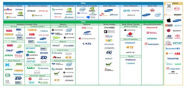 摩根士丹利进一步指出,当前人形机器人生态系统的现状是,西方投资者在人形机器人投资组合中的选择相对有限,主要集中在特斯拉和英伟达等少数企业上。