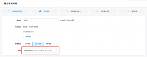 在裸金属服务器的实例规格选择界面选择合适的机型后,进入“选择镜像”步骤,选取DeepSeek-R1系列镜像创建裸金属服务器实例。实例创建并成功启动后即可通过远程连接工具登录到该实例验证并使用。