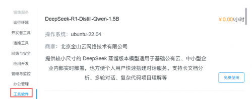 金山云已正式发布基于DeepSeek-R1蒸馏模型的多种镜像服务,用户可以在金山云官网,进入“金山云控制台”免费体验。