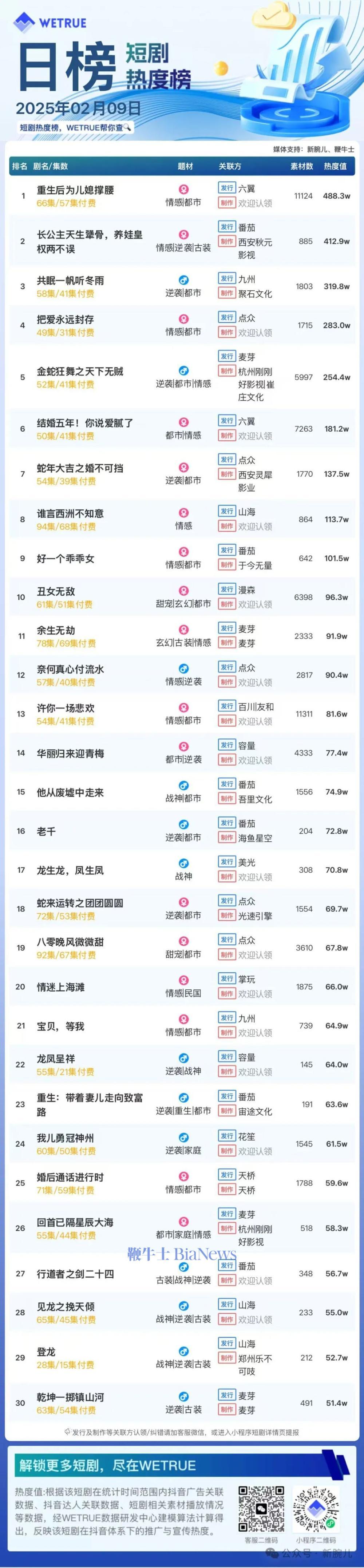 编者按:为帮助短剧从业者提供更多信息,专注于短剧报道的新腕儿和科技媒体鞭牛士联合WETRUE短剧热度榜共同推出短剧热度榜。