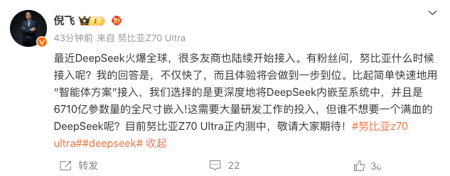 2月10日,中兴通讯终端事业部总裁、努比亚技术有限公司总裁在社交媒体平台发文称,努比亚选择的是更深度地将DeepSeek内嵌至系统中,并且是6710亿参数量的全尺寸嵌入,“目前努比亚Z70 Ultra正内测中,敬请大家期待”。