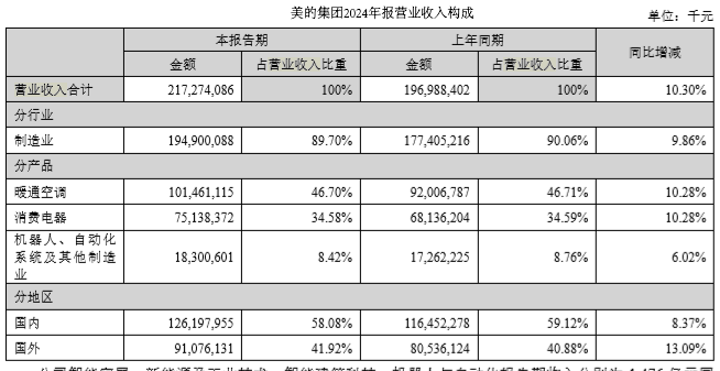 中国家电网回溯了美的集团2013年的年度报表,并与其2024年半年报进行了横向对比,可以看到2013年左右,美的集团的主营业务是家电及相关零部件产业,而到2024年其在传统暖通空调、消费电器的基础上拓展了机器人、自动化系统及其他制造业务,toB业务贡献显著增长,预计全年其B端业务贡献值将在360亿元以上。而B端业务也成为美的实现科技转型,打造“第二成长曲线”的重要支撑,在此次广东“高质量发展大会”期间,方洪波提到,在本轮人工智能引领的新一代产业变革中,机器人正在成为推动社会进步与产业升级的关键力量,美的从2015年开始布局机器人产业,后又通过收购德国库卡不断突破技术瓶颈,目前美的顺德库卡智能制造科技园已累计交付工业机器人超8万台,美的在全球机器人市场已处于技术领先地位。据美的方面透露,截至2024年底,美的集团内部自动化率达到45%,以美的武汉空调制造工厂为例,该工厂配备有331台工业机器人、82台智能检测设备和38台先进智能物流设备。美的拓展的机器人、自动化业务,不仅通过“内部配置”实现了集团整体生产效率的提升,同时还形成了可对外复制、销售的智能制造服务配套能力。