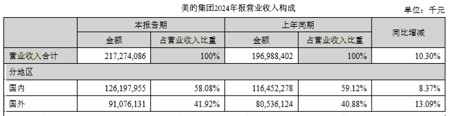 当前,全球经济增长乏力,近年来更是不时传来国际家电品牌战略收缩、资产转让的消息,如瑞典伊莱克斯、德国AEG、日本松下电器等均由于利润亏损或不及预期,选择出售或重组家电相关资产。而中国家电企业也感受到了市场的寒意,尽管2024、2025年国家出台有系列政策如“以旧换新”补贴来为国内经济护盘,但对于补贴退出后市场长远的增长压力,行业保持谨慎态度。伴随中国房地产市场熄火,作为产业链后端的家电企业亟需找到新的增长支撑。方洪波的“全球突破”策略也是当下大环境中的必然之举,2024上半年美的集团国外营收910.76亿元,占到集团总营收的40.88%,这一比例乍看不低,但是对比2013年其海外营收40.11%的占比,比重提升并不大。与美的集团同期发布的海尔智家2024半年报显示,公司上半年海外营收为708.24亿元,尽管从绝对值来看不如美的集团,但要注意,海尔智家仅代表海尔家电板块的营收,而非海尔集团营收。另外,单纯从海外业务占比来看,海尔智家的海外营收已经占到公司总业务的52.22%。当前,中国家电行业存在这样一种观点,即企业未来营收的“大头在外”,这主要由市场人口基数和增长潜力决定,伴随中国主要家电品类进入存量换新阶段,国内家电市场已经从“高增长”状态转向“稳步释放”阶段。