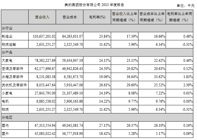 在做大主要品类市场占比的同时,美的还扩充了诸如干衣机、洗碗机、净水器等具有高附加值的新兴家电;同时,通过旗下品牌矩阵的完善,尤其是COLMO、东芝等高端品牌的提升,美的在保持家电销售规模扩大的同时,也大幅提升了产品毛利率,2013年其制造端毛利率为23.84%,现在则提升了5个百分点至28.84%。这些举措,为其4000亿元营收大关的跨越打下良好基础。