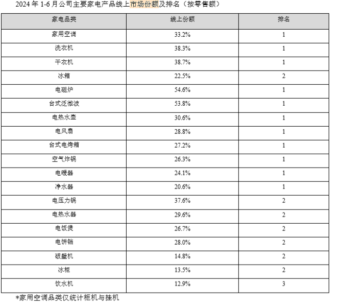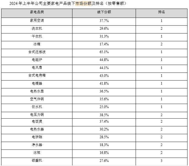 尽管B端业务代表“全村的希望”,但美的具有传统优势的家电业务仍是其营收贡献的主力。通过提品质、创品牌、增品类,美的在家电市场的竞争力不断增强,这从其产品的市场占有率便可看出端倪。以空、冰、洗等大家电为例,2013年美的空调市场占有率为21.6%,到2024上半年,其空调线上、线下占有率分别提升至33.2%和37.7%;2013年美的冰箱市占率仅为7.3%,如今其线上、线下市占率分别达到了22.5%和17.4%;另外,其洗衣机2013年的市占率为16.8%,如今线上、线下的市占率则提升至38.3%和29.6%......