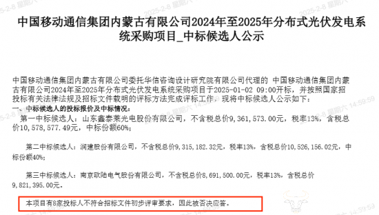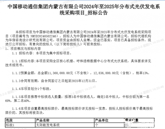 2024年12月5日,内蒙古移动发布“2024年至2025年分布式光伏发电系统采购项目”招标公告。公告显示,项目采购内容为全区核心机楼、呼和浩特数据中心分布式光伏系统,预算总金额不含税达到1136万元,含税达到1183.6万元,规模不算小。