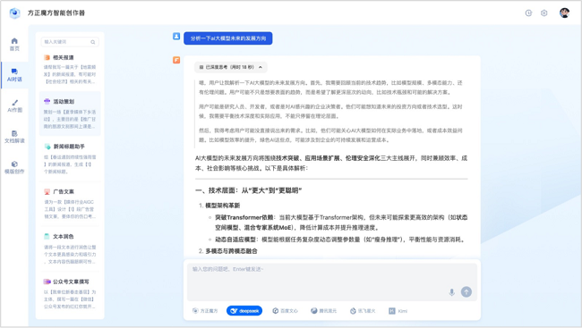 此次通过与DeepSeek的深度对接,引入DeepSeek的先进架构和技术,使方正魔方媒体大模型在自然语言处理、多模态融合、深度推理等方面实现了质的飞跃,进一步提升了模型的性能和智能化水平,以更高的效率和更精准的结果为媒体行业提供支持。