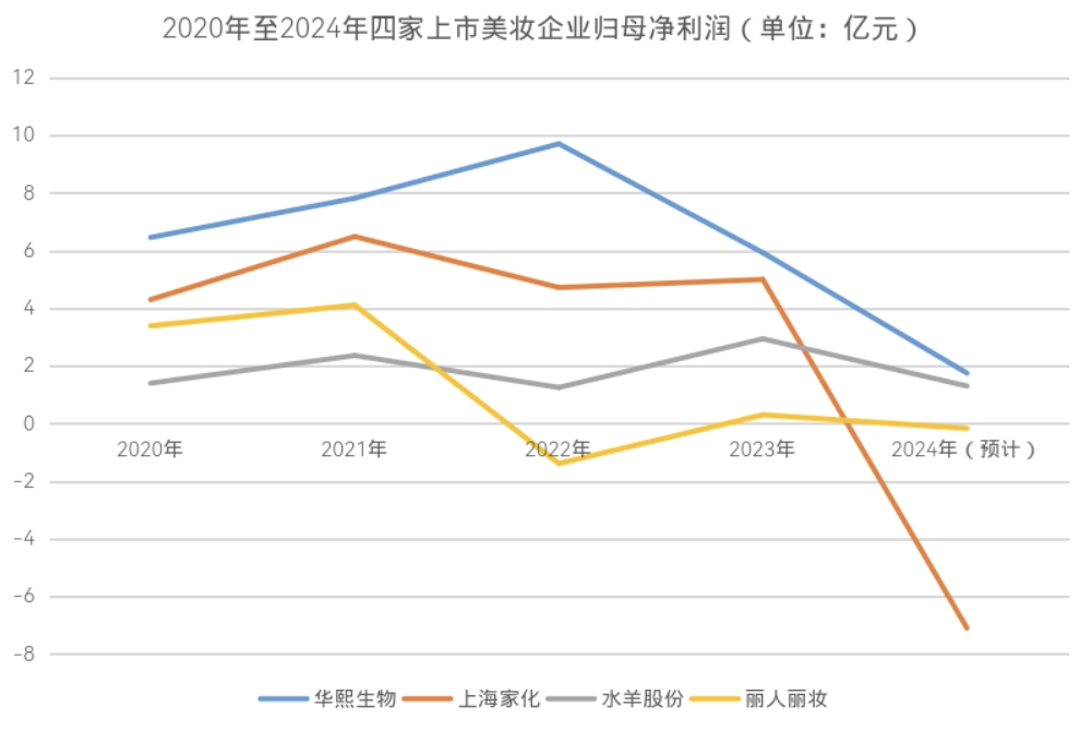 【亿邦原创】日前,华熙生物、上海家化、水羊股份、丽人丽妆四家上市美妆企业发布2024年全年业绩预告。三家美妆企业2024年的归母净利润,均同比减少50%以上、均未超过2亿元。