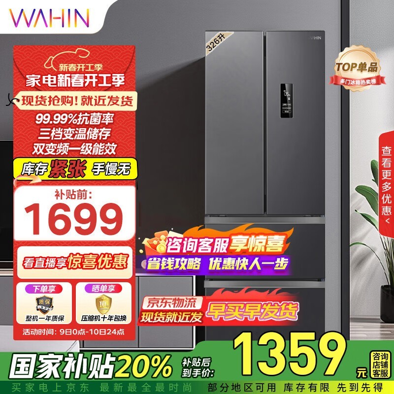 华凌 BCD-326WFPH 风冷多门冰箱,采用一级能效双变频技术!