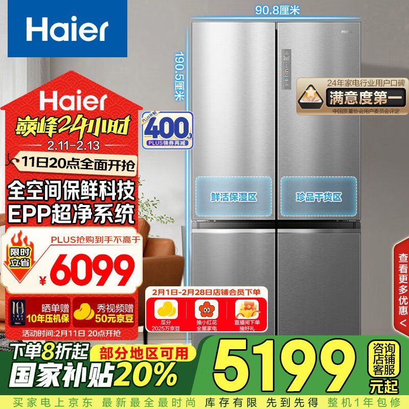 海尔Haier 全空间保鲜科技冰箱,5064元到手史低价!