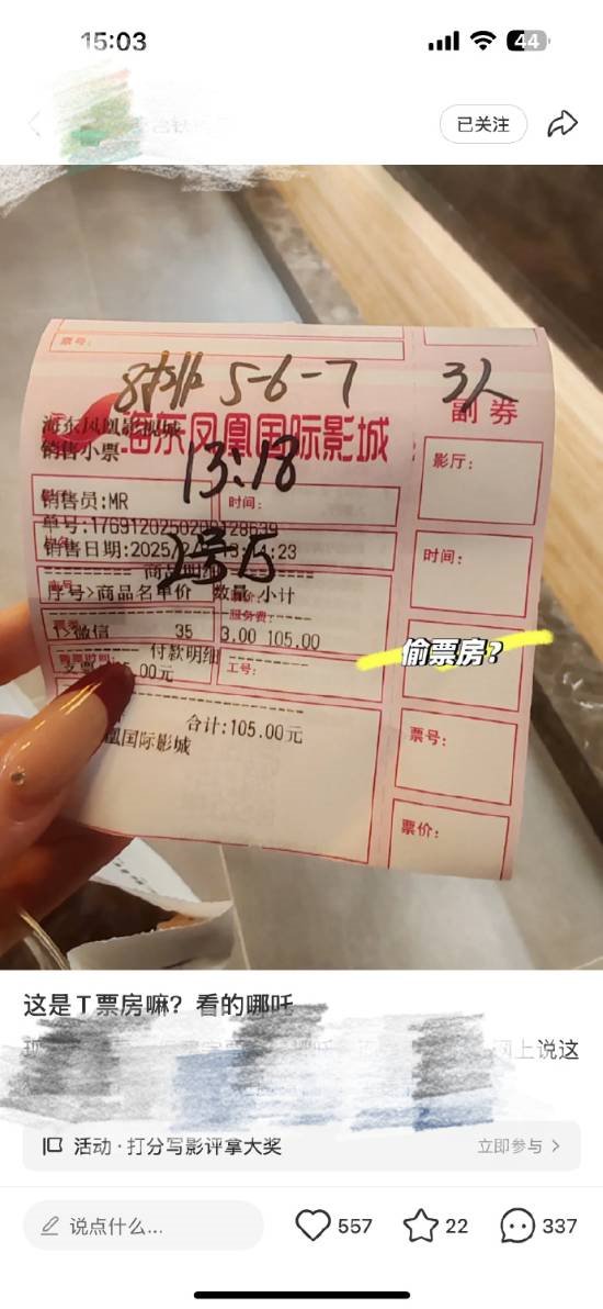 2月9日,青海一博主发帖称,自己一行三人去看《哪吒2》,买到的电影票没有打印、电影信息,影厅、时间和座位号均系手写,怀疑是偷票房,并向中国电影协会公众号电影票房监督进行了举报。