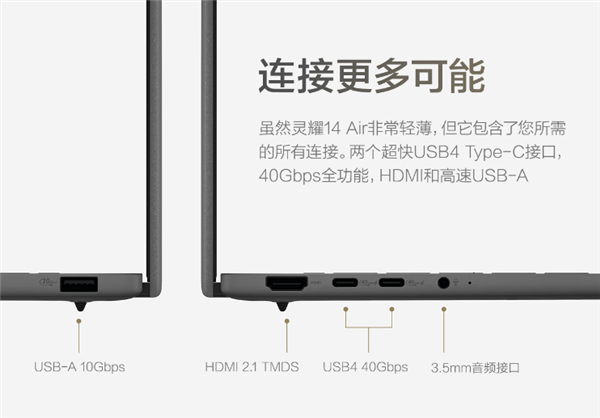 大尺寸触控板,SmartAMP杜比全景声立体扬声器,1080p+红外双摄像头,两个USB4、一个USB-A 10G、一个HDMI 2.1和一个3.5mm音频口。