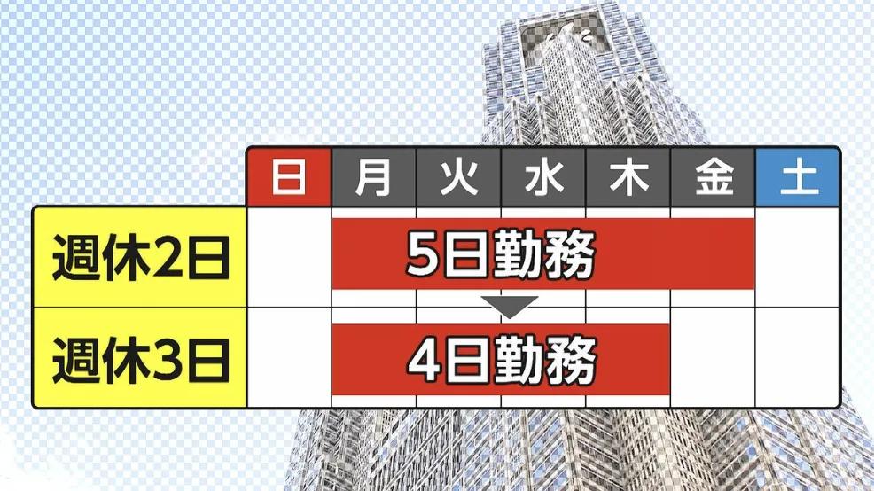 去年年底,东京都知事小池百合子宣布,计划从2025年4月起,为东京都的所有公务员引入“上四休三”工作制。