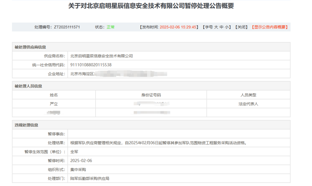 公告显示,经调查,北京启明星辰信息安全技术有限公司在参加采购活动中,涉嫌存在违规失信行为。根据供应商管理相关规定,自2025年02月06日起暂停其参加某系统范围物资工程服务采购活动资格。