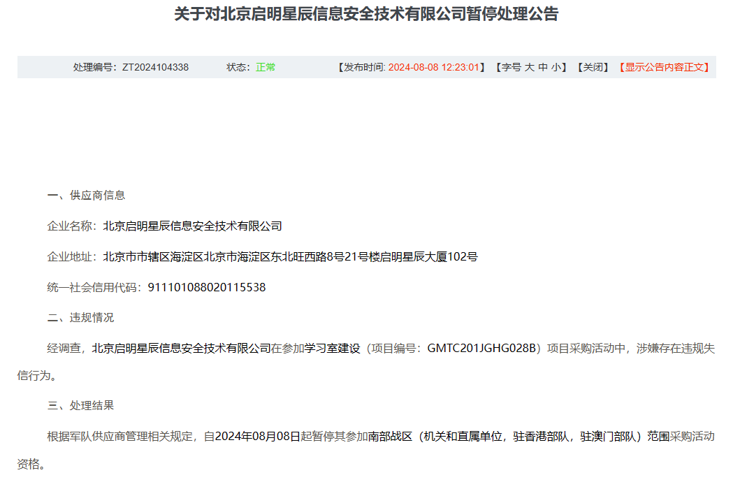 近日,某系统采购网发布《关于对北京启明星辰信息安全技术有限公司暂停处理公告》,半年前刚被列入暂停名单,如今再次被暂停投标资格,到底是怎么回事?