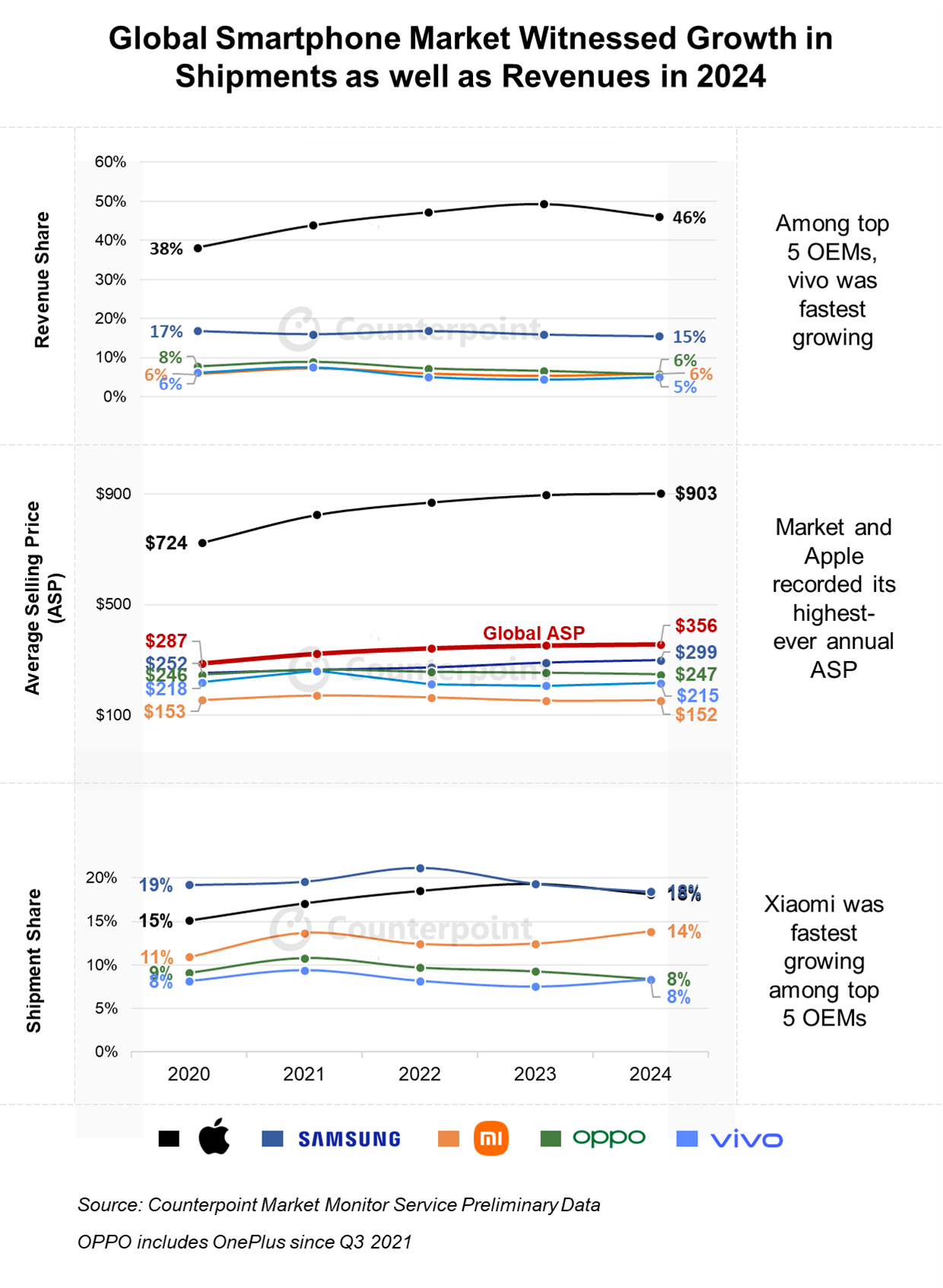 Counterpoint的最新研究显示,全球智能手机收入在2024年同比增长5%,结束了连续两年的下滑,而全球平均售价攀升至创纪录的356美元。此外,随着全球宏观经济状况和消费者信心的改善,全球智能手机出货量在两年后也出现了增长,这导致了5G采用以及更好的摄像头和更快的处理器等功能的升级。