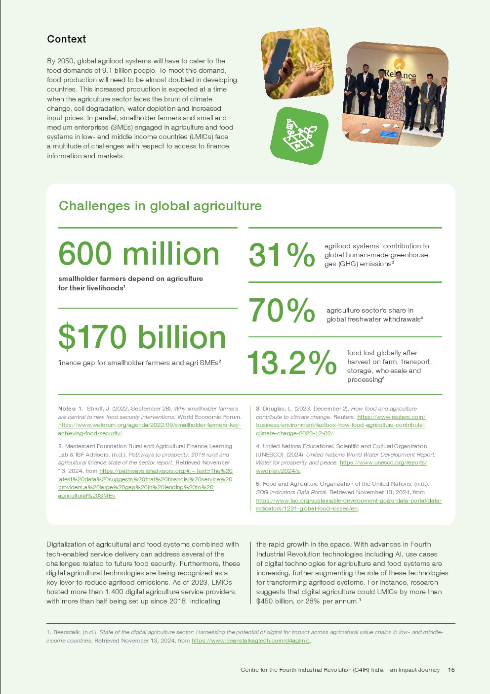 预计2050年,全球农业粮食系统将必须满足91亿人的粮食需求。为了满足这一需求,发展中国家的粮食产量将需要增加近一倍。在农业面临气候变化、土壤退化、水资源枯竭和投入价格上涨的冲击之际,预计产量将出现增长。与此同时,低收入和中等收入国家从事农业和粮食系统的小农和中小企业在获得资金、信息和市场方面面临着诸多挑战。